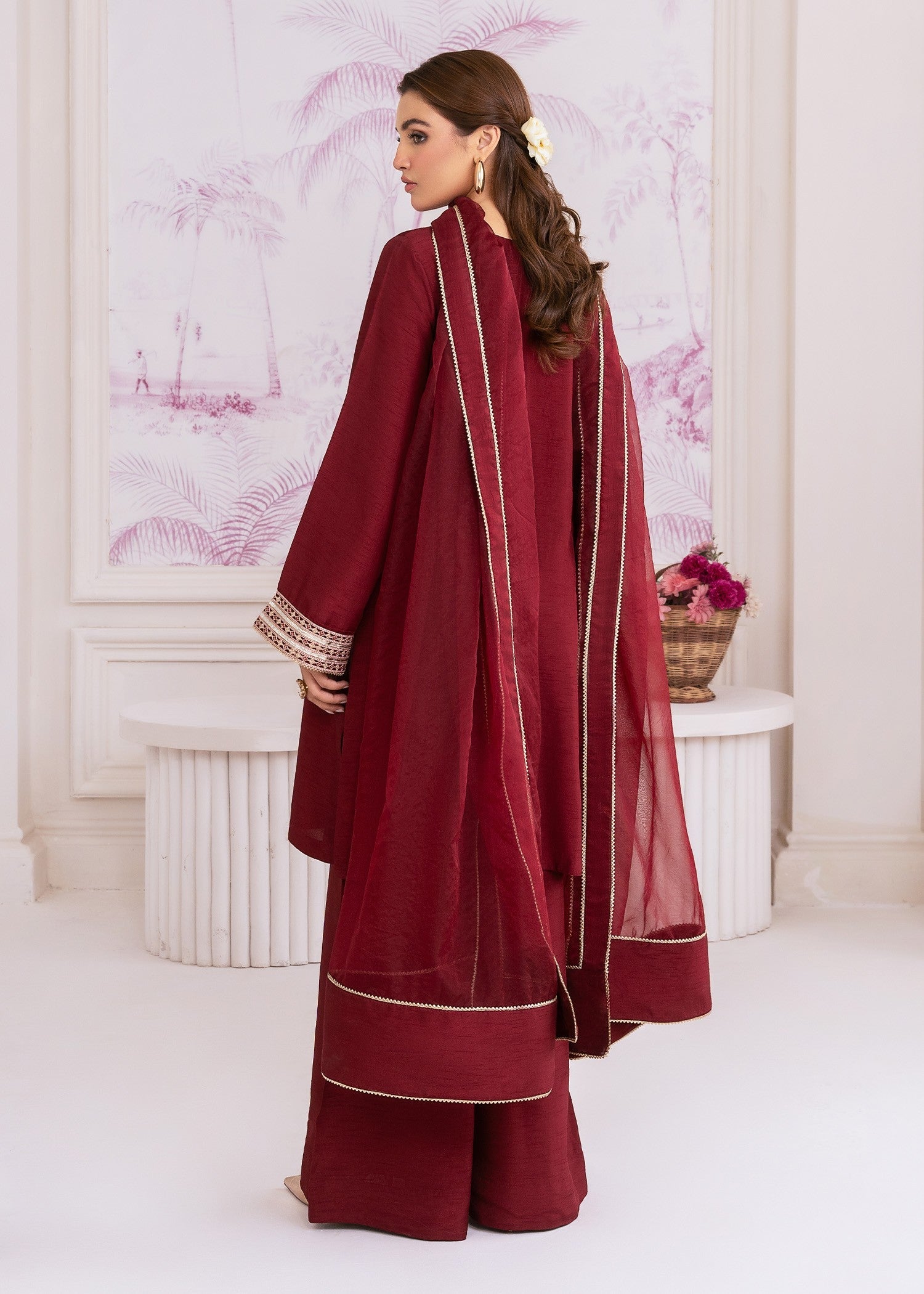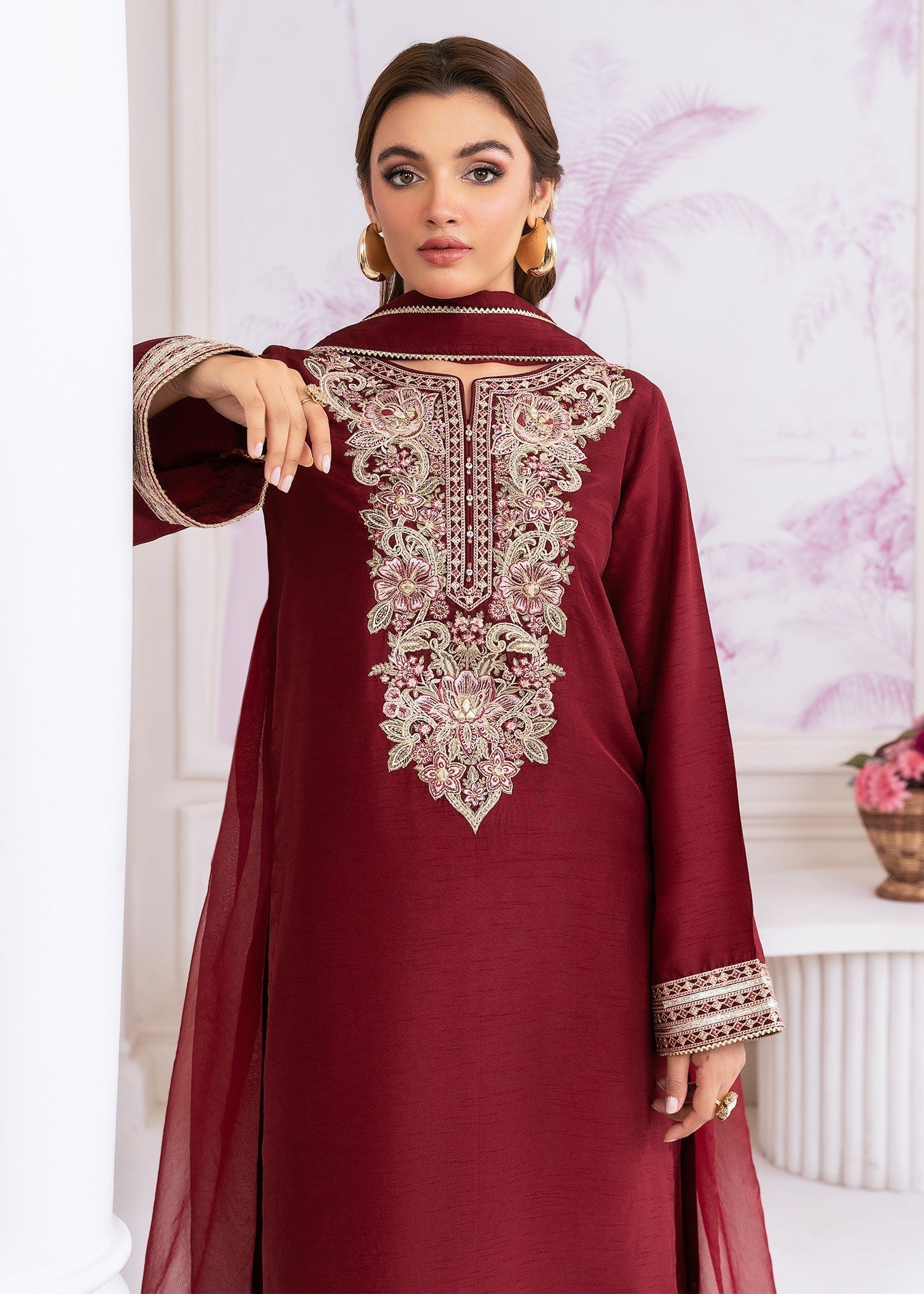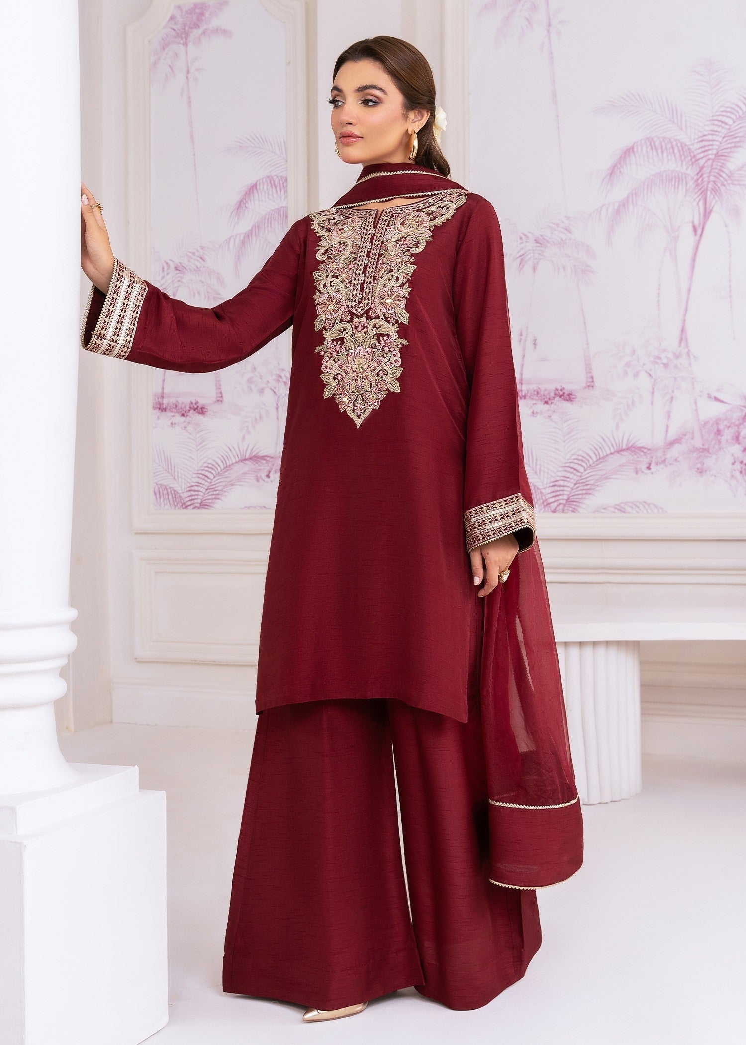 Draped in luxurious khaddi silk, SOPHIARA is where refined craftsmanship meets timeless sophistication — featuring beautifully embroidered slim-fit shirt with organza dupatta and khaddi silk flared pants for elegant festive charm.