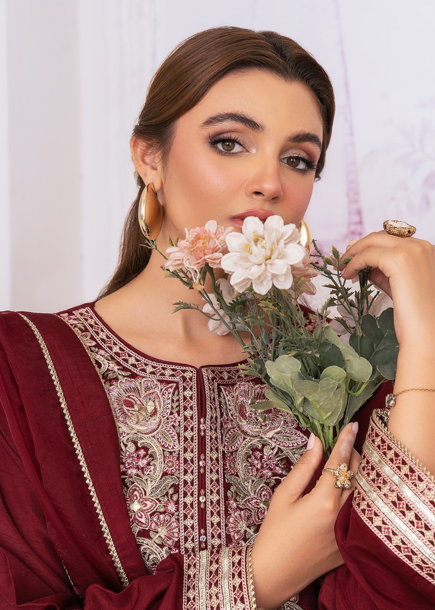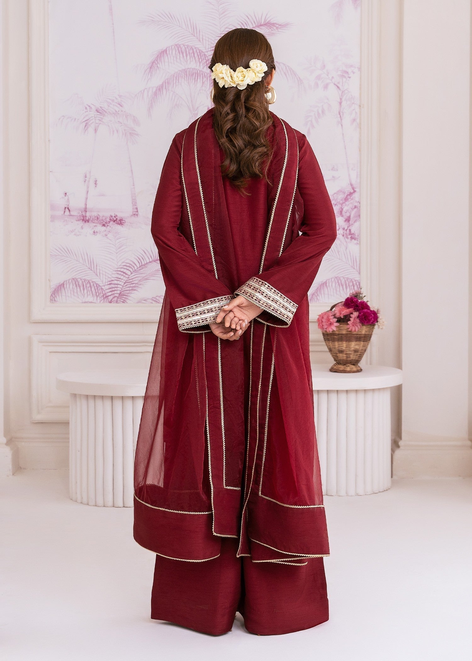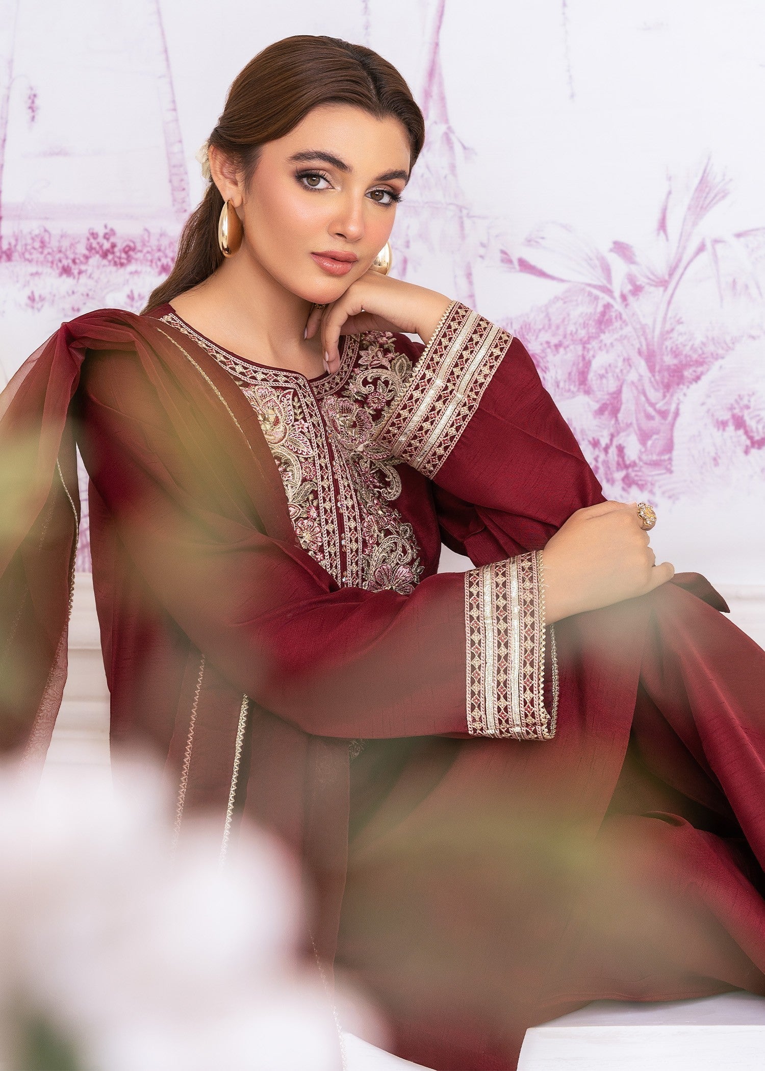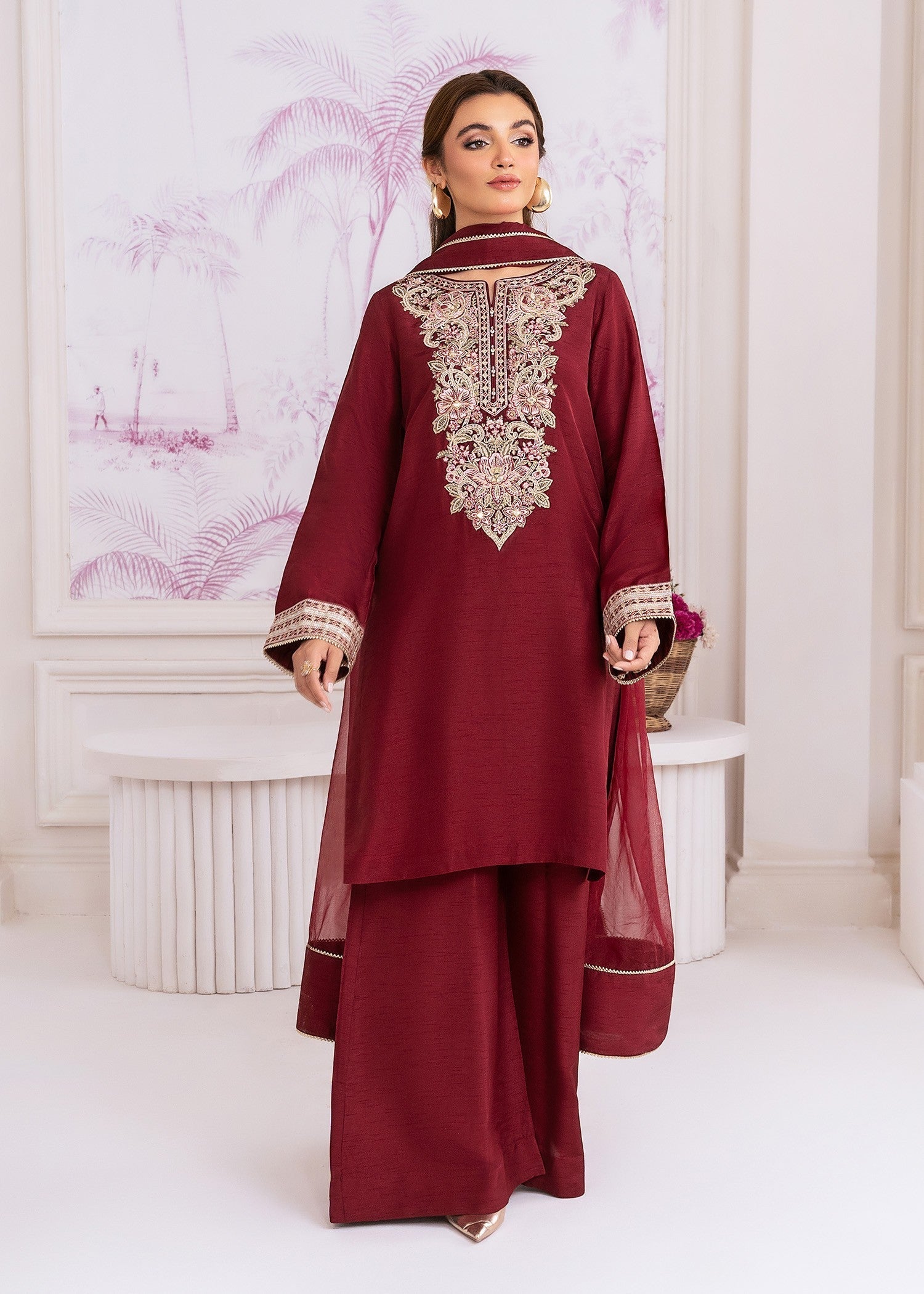 Draped in luxurious khaddi silk, SOPHIARA is where refined craftsmanship meets timeless sophistication — featuring beautifully embroidered slim-fit shirt with organza dupatta and khaddi silk flared pants for elegant festive charm.