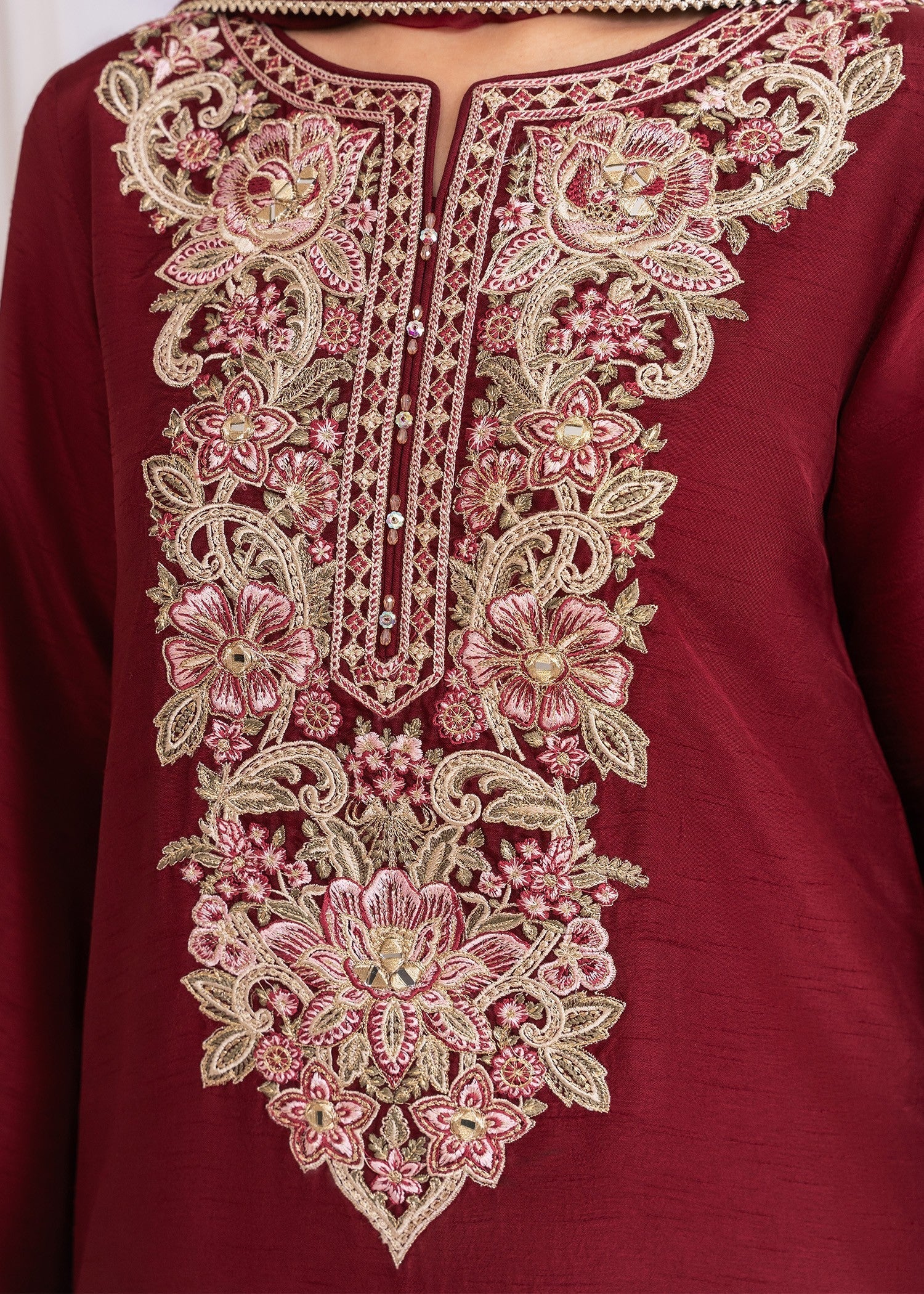- Shirt: Khaddi silk with embroidered detailing and lining attached