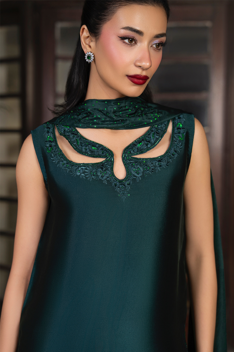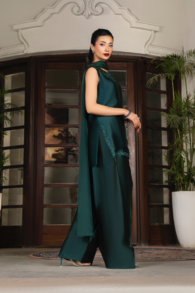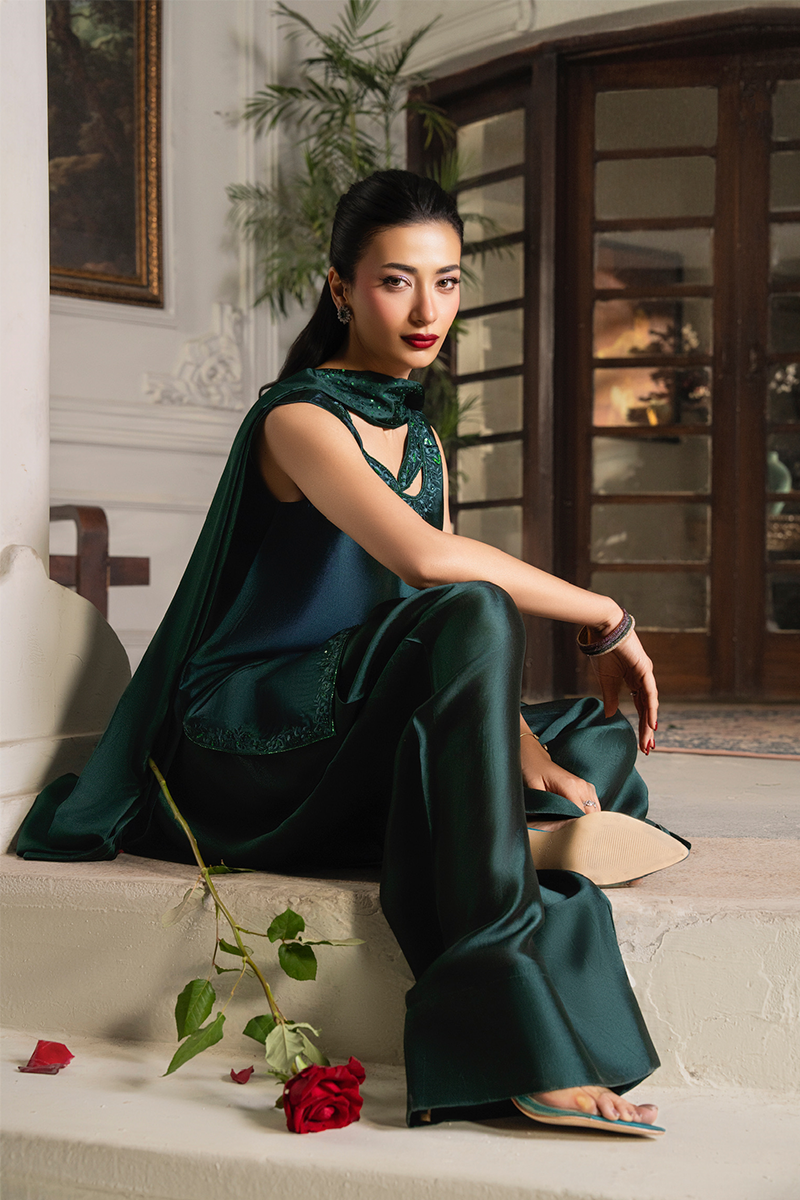 Steeped in tradition and elevated by luxury — TALIA is an exquisite 3-piece pure sheesha silk ensemble featuring a beautifully tailored silk shirt, a gracefully sweeping farshi shalwar, and a flowing medium silk dupatta, fully lined for a silhouette that is nothing short of regal.