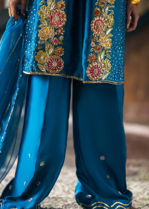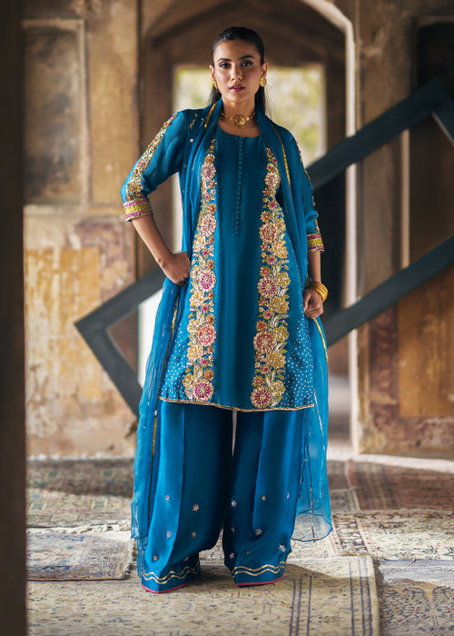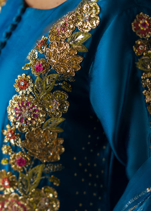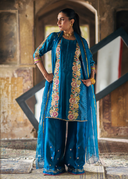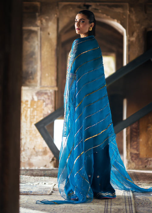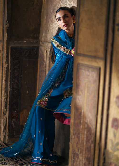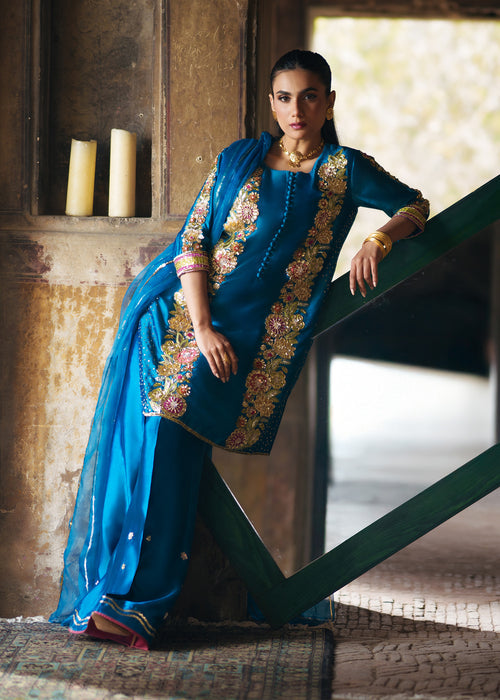 Step into refined sophistication with TEALE, where luxurious tissue silk meets impeccable tailoring — featuring a beautifully crafted ensemble paired with straight wide Korean raw silk trousers and sheer kataan organza dupatta for effortless grace.